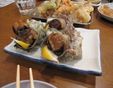 ●天満駅から北へ数分歩き、辺りに呑み屋さんが多く連なった一角にある。お連れさん達は別の店に行きたかったようだが、どのお店も一杯で席が空くのを待っている状況であった。このお店も5分ほど店先で待ったのだが、運良く席が空き立ち寄ることとなった。 ●このお店のネタは鳥取県境港から直送されているようで、魚介類のネタは豊富で値段もリーズナブルだったようだ。本日2件目でお腹もやや膨れていたが、大アサリの酒蒸しとサザエの壺焼き、天ぷら数品等を注文する。なお、ここでの料金は1人あたり2,000円弱だった。 ●ここは天ぷらがお店の売りのようで、テーブルにあるポットには天つゆが入っており各自小皿に注ぐ様になっている。また、天ぷらを注文すると山盛りの大根おろしがついてくる。ちりめんじゃこなどを持参すればこれだけで充分酒のアテになりそうだ。 ●ただこのお店もアルコールの種類は少なく、麦焼酎のロックだけとなった。今回はこの2件のみで反省会はお開きとなってしまったが、この界隈、他にもお店が多数ありまた訪れたいものと考えている。なお、お連れさんのリサーチによると、日本酒の地酒を置いているお店もあるようで、次回に必ず立ち寄って紹介できればと思うのでこうご期待ください?。 |