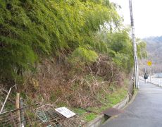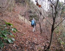●自宅の最寄り駅から電車で約10分で川西市北部の能勢電鉄山下駅に到着する。メンバー集合後は軽い時雨の中、旧城下町の山下町内を歩き県道の前川橋前交差点へと向かう。ここはどう見ても登山道入口の面影はなかったのだが、今回のリーダー「テルさん」の持っていた地図では、ここで間違いないとのことだったので、半信半疑で藪を掻き分け登り始めることとなる。