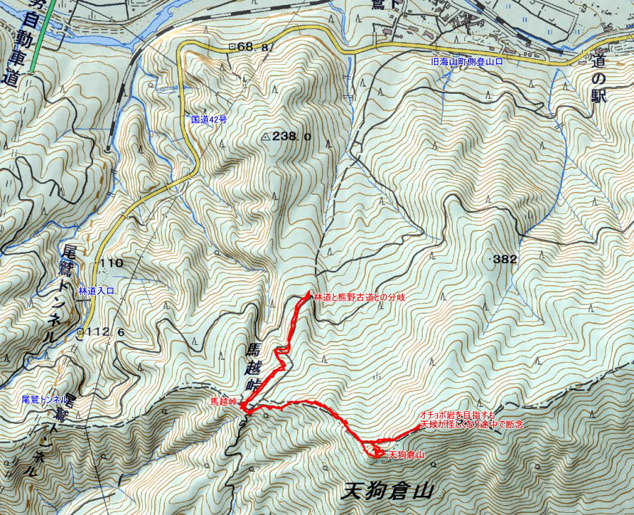 林道と熊野古道との分岐→馬越峠(休憩)→天狗倉山(522m)(休憩)→