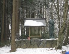 ●この山の登山コースは、表参道・北参道・水無山北尾根・竜王山経由の4ルートがあるが、今回は「表参道」コースにて山頂へと向かう。このコースは全般的に植林帯の中でのジグザグな道が主だったが、小屋や案内看板が多く設置され、整備の行き届いた登山コースであった。なお、心配?された積雪には二合目を過ぎた辺りから見受けられ、オークションで落札したアイゼンをここで装着し今回の一つ目の目的を達成する。