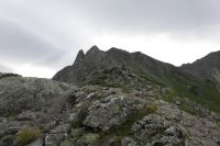 強風の吹く中、ガレ場の尾根道を下る。