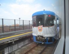 ●2日目の列車の旅は、JR高知駅からの土佐くろしお鉄道阿佐線(通称ごめん・なはりせん)で始まった。この路線は2002年に開通した日本最後のローカル新線で、計11両の車両がそれぞれ趣向を凝らしたデザインとなっている。我々が楽しみにしていた最も派手なデザインの「阪神タイガース優勝応援列車」は乗車することと観ることもできなかったが、今回はアニメのアンパンマンの作者である「やなせたかし」さんが作詞した曲にちなんだ「てのひらを太陽に号」に乗車する。