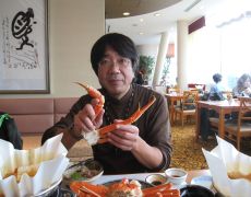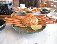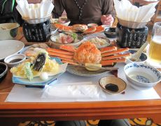 ●車内で恒例の「スナックJR」をしてしまったことから、カニ料理に備え駅からは45分程を歩く。道中とても寒かったが道中雪に降られることなく何とか「リラ・ポート」に到着する。ここの天然温泉で入浴を済まして心身共にリフレッシュし、いよいよお待ちかねの「カニ料理」とご対面する。