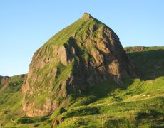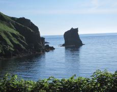 ●礼文岳の登頂を終え連日の山歩きとなったことから、当方の下半身は既に限界状態となっていた。内路登山口駐車場からレンタカーで本日の宿泊地となったユースホステル「桃岩荘」へと向かう。「桃岩荘」は礼文島南西側の元地海岸の端にあり、近くの展望台「桃台猫台」から「猫岩」と「桃岩」を眺めることができた。