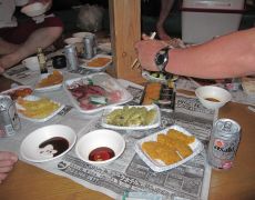 ●魚沼市の関越自動車道小出ICの北側にある施設で、温泉棟や宿泊棟、並びにキャンプ場もあり施設はかなり充実しているように感じた。今回はここのキャンプ場にあるソフトハウスに宿泊する。入浴後に恒例の反省会が始まったのだが、天気は雨模様となったので、ハウス内でお総菜等での反省会となった。やがて反省会もお開きとなり、各自雑魚寝状態で就寝し翌日の登頂に備えることとなった。