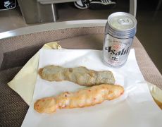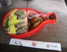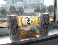 ●メンバー皆、ハイピッチで飲酒が進み各自が用意していた缶ビールは、岡山県内で全て飲み干してしまう。よって、当初の予定では岩国駅で昼食を摂ることとなっていたが、急遽、広島駅で途中下車し駅弁等を調達することとなる。当方は、時刻表に載っていた広島駅の駅弁「しゃもじかきめし」と同じ広島名物の「棒天」を購入する。
