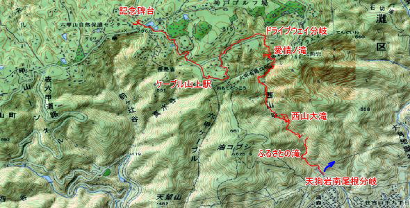 天狗岩南尾根分岐→ふるさとの滝(休憩)→西山大滝(休憩)→