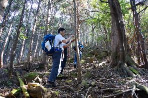 ●車道の終点から本格的な登山道となったが、前回の遠征と同様にこのルートも道はかなりの荒れ気味で、かつ勾配のきついところも多くあったのでGPSの軌跡と樹木に巻かれたテープを頼りに慎重に足を進める。身体的と精神的にもかなりきつい山行きとなり、時間も思いの外要すこととなってしまったが、何とか無事に山頂に到着し前回のリベンジを果たす。
