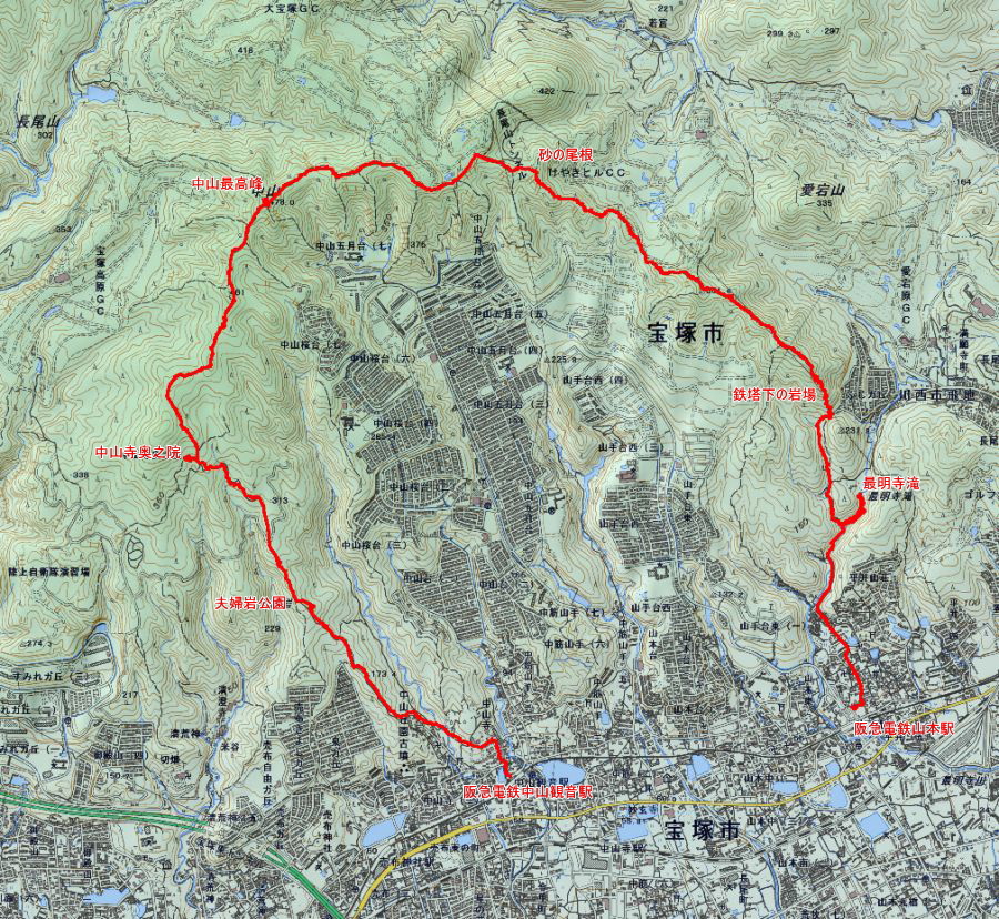 中山最高峰(478m)(昼食)→中山寺奥之院(休憩)→夫婦岩公園(休憩)→阪急電鉄中山観音駅