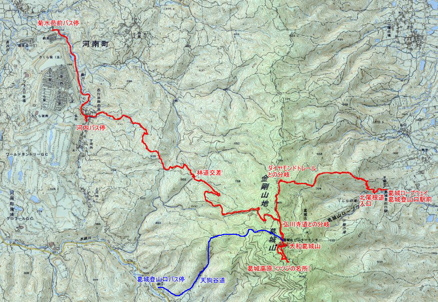 ●当初の予定では、天狗谷道を下山し葛城登山口バス停で1日4往復の金剛バスで富田林駅前へと向かう予定だったが、弘山寺道を下り河内バス停へと向かう方が早いと勘違いしてしまう。下山の途中で気がついたのだが河内バス停までが約50分と思い込んでいたが、実際は林道交差までで、河内バス停まではさらに1時間を要するルートだったようだ。