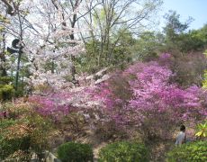 ●中山最高峰で昼食と昼寝をした後は、中山寺奥之院に立ち寄らず東方尾根手前の分岐から下山するコースとなった。分岐を左折しいきなりの急な下りで足元に気を遣ったが、難所もここだけで暫くして東方尾根に合流し、今回の目的であったヤマツツジの開花を観ることができた。また、中山寺梅林公園ではヤマツツジと併せて満開の桜も眺め、その後は中山寺を経由して阪急電鉄中山駅に到着し下山を完了する。