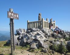 ●山頂付近は、登山客と共に伊吹山ドライブウェイからきた観光客で、山頂山小屋や売店は多くの人が訪れていたことから、早々に旧測候所近くにある三角点へと移動しここで大休止となった。ここからの眺望は、南側に関西百名山の藤原岳と御在所岳や、北側には日本百名山の荒島岳、また、北東側の彼方にある御岳までを収めることができ、約5年越しのリベンジを果たす。