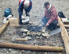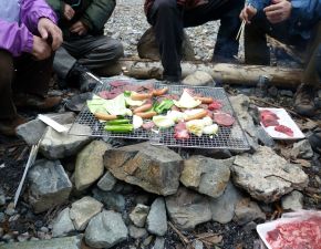 ●当方と下山の得意?なお連れさんは、納会場所の会場設営のためメンバーと離れ先に下山となる。例年と同様に足場の悪い初谷渓谷コースを、足元に気を遣いながら一気に下り納会場所の初谷川河原に到着する。ここで納会のみ参加のメンバーと合流し、宴の準備に取りかかる。なお、合流したメンバーの手際が余りにも良かったことから、思いの外スムーズに準備を終えることとなる。