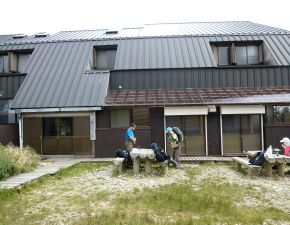 小屋前のベンチで昼食