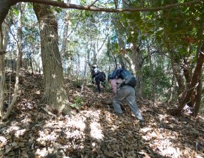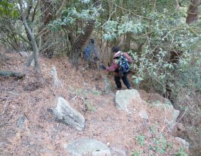 ●昼食後は、当初は摩耶山北側にある新穂高へと向かう予定だったが、北側の斜面は残雪が多く危険であることから、急遽取りやめて南斜面の山寺尾根のルートで下山することとなる。なお、下山も往路と同様に薮道で山の地図には記されていない「山寺西尾根」でのルートとなるが、時間的にもかなりの余裕があったので、道中の「御塔岩」で長めの小休止を入れ、足元にもを遣いながら慎重に下り何とか無事に下山を終える。