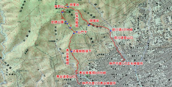 神戸市営バス青谷停留所→青谷道登山口→青谷東尾根との分岐→送電線鉄塔下(休憩)→