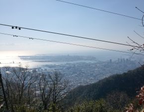 ●青谷道を歩き始めてから直ぐのところにある青谷東尾根との分岐を右折し、踏み跡が殆どない尾根道を登ることとなる。この尾根はいきなりの急登で、また、このルートはすれ違う他の登山客もなく、登山道は多くの落ち葉に覆われ何度も足を滑らしてしまう。さらに、所々に視界が開け、海側の眺望を楽しみながらの山歩きとなったことから、行程距離は短かったが思いの外時間を要し、また、何時もの山行きと比べて当方の足腰に負担がかかることとなった。数度の休憩を入れながらやがて登山道は上野道に合流し、ここから旧天上寺史蹟公園を経て摩耶山頂に到着する。その後は、山頂からすぐ近くにある椈星台へと向かいここで昼食を取る。