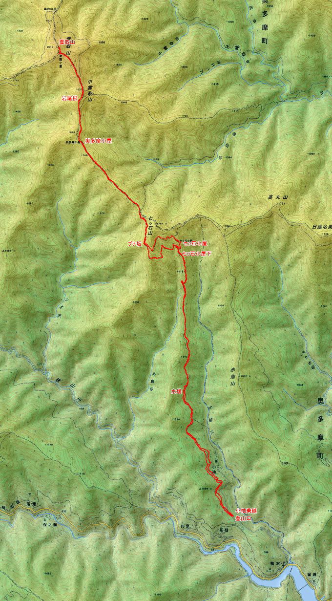 小袖乗越登山口 → 水場(休憩)→ 七ッ石小屋下(休憩) → 奥多摩小屋(休憩)→