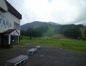 ●早朝に蔵王山の登頂を済ませ、午後からはこの日2つめの日本百名山の安達太良山へと向かう。あだたら高原スキー場の駐車場に到着した直後に雨が降り出し、ここで約30分程待機することとなったが、直ぐに雨は止み小康状態となったので手早に身支度をする。なお、午後からの出発となったため、時間の関係で山頂の登頂はスキー場のゴンドラリフト「あだたらエクスプレス」を利用することとなる。