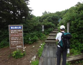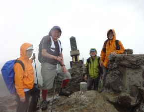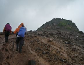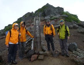 ●リフト山頂駅から仙女平分岐を過ぎた辺りから再び雨が降り出し、山頂に近づくにつれさらに雨は強くなる。道中に雨具を羽織ったが用を足さず、登山靴の中までズブ濡れとなりながらでの登頂となってしまう。山頂からの安達太良三群と磐梯山や吾妻連峰の眺望を楽しむこともなく、記念撮影のみでここを後にし下山の途に着く。
