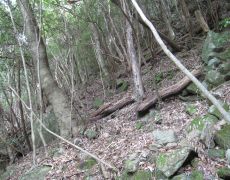 ●林道終点から山頂までは尾根伝いの急登な道となり、メンバー皆前日からの疲れもあり足取りは重くなる。結局、山頂への到着は地図にあるコースタームより30分遅れての到着となってしまった。また、山頂は樹木に覆われ付近の山々の眺望も僅かで、期待していた帽子岩はここから望むことはできなかった。何時ものように山頂で昼食を取り、下山の長丁場に向けて鋭気を養うこととなる。