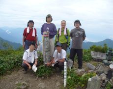 ●小倉山のポイントを過ぎた辺りから二日酔いも収まったのだが、登山道は急登に変わり疲れも癒えぬままの状況が続く。数度の小休止を重ねやっとの思いで駒の小屋を経て山頂に到着する。なお、山頂はやや雲は多めだったが視界も良好で、翌日に登頂する予定の平ケ岳の眺望等を楽しむことができた。ここで昼食を取ながら1時間弱大休止し下山に備える。
