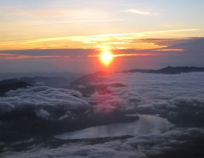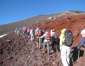 ●昨日の夜と同様に、宿泊地でも寝不足で前日の疲れが取れぬまま、午前3時45分にここを出発する。歩き出して暫くして、本七合目の手前で御来光を受ける。標高も3,000mを越え、少し歩くと直ぐに息切れする状態が続いたが、数度の小休止を重ねながら山頂へと向かう。