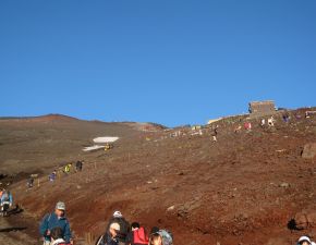 ●本八合目を越え吉田ルートと合流したことから、登山道は山頂の浅間大社奥宮までの間渋滞が続くこととなる。当方、疲れと息切れが続き、歩行のペースがかなり遅くなっていたので丁度良かったかも知れなかったが、九合目辺りからは渋滞も激しくなり所々で立ち止まることが多くなる。結局、山の地図では通常九合目から山頂の「浅間大社奥宮」までが35分のところが、結果的に1時間以上もかかってしまった。