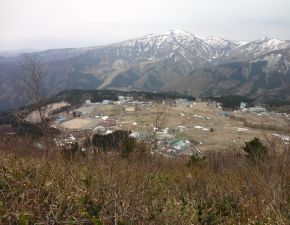 ●宿泊地での撤収を終え車でハチ北高原スキー場ゲレンデ方面へと向かう。なお、登頂はこのゲレンデからと覚悟はしていたのだが、今回はゲレンデ等に残雪がなく、運良く?山の中腹にある林道出合まで車で行くことができたことから、メンバー皆の思惑どおり往復で約1時間の行程での楽チンの山行きとなった。