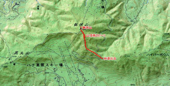 林道出合→山頂南のピーク→鉢伏山(1,221m)→林道出合