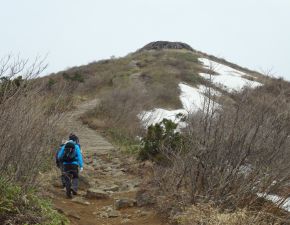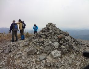 ●林道出合からは勾配のきつい階段状の登山道が続き当方はやや息が上がったが、前日までの遠征の疲れを感じることもなく山頂へ到着する。なお、この日は3日間の遠征の中で一番天候に恵まれていたようで、間近にそびえる氷ノ山の全景を充分に堪能することとなる。しかしながら、山頂付近は風がとても強く、山頂での滞在も程々に下山となってしまう。なお、昼食は残念ではあったが下山後の林道出合にて昼食を取ることとなる。