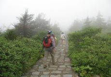 ●遊歩道は、石畳の舗装道で勾配が緩やかで、時間は遅かったが観光客も訪れていた。また、雨は降らなかったが、ここもガスが立ち込めていたので、足早に頂上へと向かう。