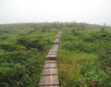 ●玉子岩の分岐からは、ぬかるんだ道を幾度となく足元を滑らせながら慎重に下る。途中の休憩で、宿で作ってもらった昼食を取りメンバー皆無事に下山を完了する。マイクロバスの出発時間は午後1時だったが、時間的にも余裕で平ケ岳出合に戻ることができた。