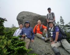 ●風化が進んだ自然の造形奇岩「玉子岩」に立ち寄りその後山頂へと向かう。ここからは前半とは違い勾配も緩く、また、山頂までは木道となっていたので難なく山頂へ向かうこととなる。やがて山頂に到着しメンバー全員で記念撮影を行なったが、山頂は木道から外れたところにあり、また、スペースも殆どなかったのでここで小休止せずそのまま下山の途に着く。