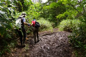 ●キャンプ場での幕営の受付時に燧山草のスタッフに登山道の状況を確認し、燧ヶ岳の登頂ルートは見晴新道からとなる。なお、見晴新道は岩が多く登山道の状況は良くなく、さらに急登の連続となったが、下山の長英新道は道の勾配が緩やかなものの、泥濘の連続が長く続き結果的にルートの選択は正解だったように思える。