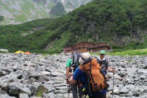●当方、上高地はこれまでに訪れたことがなく、歩き始めて暫くは観光気分での山行きとなったが、横尾までは「奥上高地自然散策路」で勾配の緩い道だったので、山の地図にあるコースタイムよりかなり早い歩行のペースとなる。また、横尾からは本格的な登山道となったが、ほぼコースタイムどおりに宿泊地の「涸沢小屋」に到着、早々にウェルカムビールを飲み干すこととなる。なお、この日は降雨はなかったが、風も弱くかなり暑かったので、メンバー皆昼寝などで宿泊地で十分に体の疲れを癒し、翌日の奥穂高岳の登頂に備えることとなる。