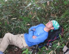 ●数度の小休止を経て到着時間はバラバラだったが、何とがメンバー全員山頂へとたどり着く。山頂は天気が良ければ、中ノ岳、家ノ串、前武尊、剣ケ峰山の連峰や彼方にある富士山までを望むことができるとのことだが、ガスが掛かり期待した眺望はなかった。暫く待ったのだが、ガスが晴れる気配もなさそうだったので諦めて下山をすることとなる。