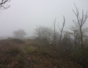●この「依遅ヶ山」のコースタイムは、「関西百名山」の本では往路(上り)が約40分で復路(下り)は約30分となっていたが、この日は登山口から山頂への登頂まで小雨が降り続き、雨合羽を着用し傘を差しながらの山歩きとなり思いの外時間がかかってしまう。また、コースタイムは比較的に短いものの、登山道の勾配も程々にあり、翌日以降の山行きの足慣らしとして丁度良かったかも知れない。しかしながら、山頂では期待された眺望に恵まれず、残念ながら足早の下山となってしまう。