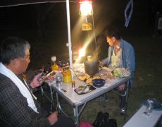 ●下山後に、初日の夕食の食材の買い出しを行うこととなっていたので、半作嶺登頂後は時間の余裕がなくなり足早に下山を始める。下山後は、麓の「富里温泉乙女の湯」で入浴(料金は500円)を済まし、田辺市街地に戻りスーパーで夕食の買い出しを経て川湯遠征恒例の定宿「川湯野営場木魂の里」へと向かう。野営場でいつものようにテント等を設営し、反省会が始まった頃には17時過ぎだったが辺りは既に真っ暗になっていた。