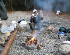●初谷川河原に到着後すぐに会場設営を行う。木炭の火おこしも難なくこなす。乾杯を行い肉を焼きだした頃に天気が急変し時雨れ出すが、短期間であったため事なきことを得る。何事もなかったように納会は進んでいく。