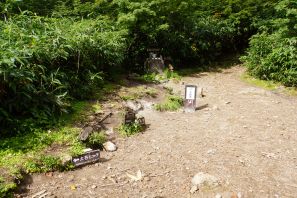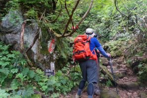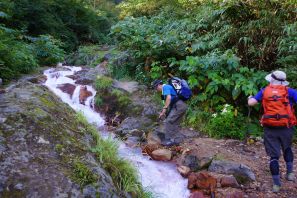 ●この日も山行きの行程が長丁場となることから、夜明け前に幕営地の戸隠キャンプ場での撤収を済まし、この日の最寄り口となる燕温泉バス停まで車で向かう。この山は最寄り口からの標高差は約1,300mで、前日の高妻山と比べややきつく不安が募ったが、燕登山道の温泉源泉管理小屋までは比較的に勾配が緩やかであったため、難なくここに到着する。