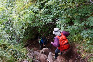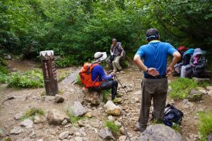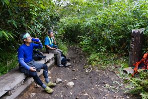 ●山頂からの下山は当初は燕登山道を引き返す予定だったが、クサリ場を避けたいとの思いからメンバー全員一致で燕新道を下山することとなる。しかしながら、いきなりの急勾配の道を下ったことから、思いの外体力を消耗し小休止の回数も増え想定した以上に時間がかかってしまう結果となってしまった。何はともあれ無事に燕温泉バス停までの下山を終え今回の遠征での山行きを終える。