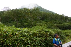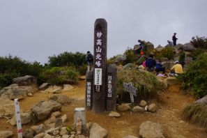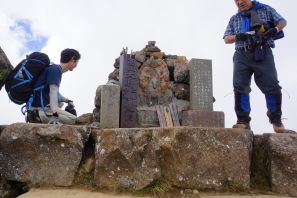 ●温泉源泉管理小屋の水場で給水しここで英気を養ったが、北地獄谷麻平分岐辺りから道の勾配は段々ときつく、また、前日から疲労の蓄積もあり徐々に歩行のペースが鈍る。胸付八丁やクサリ場の急登を天狗堂など数度の小休止を経ながら、何とか山頂にたどり着く。なお、山頂では辺りは雲に覆われ前日と同様に他の山々の眺望を楽しむことはできなかったが、当方は高妻山登頂時の精根尽き果てた状況でなかったので、ここで昼食を取り大休止することとなる。