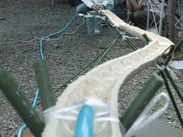 ある人から竹を調達し、半分に割り節を取り表面を整える。竹がたまたま曲がっており接合部の角度に苦労したが、結果的にはアクセントのある構造となった。