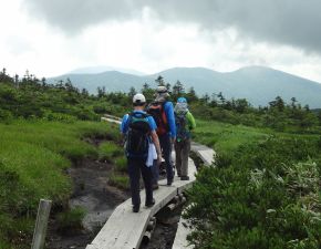 ●今年の夏季研修協議会も最終日となり、この日は福島と山形県境にある吾妻連峰の最高峰である日本百名山の西吾妻山を目指す。宿泊地で朝食を済まし、国道115号と13号等で山形県米沢市街地を経由して、最寄りの天元台高原ロープウェイ湯元駅駐車場に到着する。この日も前日と同様に、山行きの連続からの体の疲労に配慮?し、山頂への登頂はロープウェイと夏山リフトを利用することとなる。