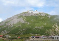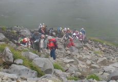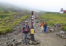 ●剣ケ峰口からの登山道は、距離も短くそれほど急勾配では無かったが、標高が高いためか時々息苦しくなった。山頂はガスが立ち込め付近の山々の眺望を楽しむことが出来なかった。また、場所も狭く続々と登山者が登頂してくるので足早に撤収する。