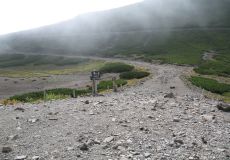 ●畳平からもガスが晴れる気配が無かったため、富士見岳を経由せず西側の道幅の広い登山道から剣ケ峰口(肩の小屋)を目指す。