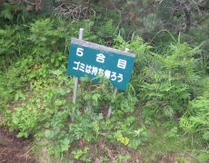 ●三合目の「甘露泉」で水を調達し、山頂へ向け鴛泊コースを歩くこととなる。このコースは主要ポイントに看板が設置され、また一本道であることから道に迷うこともなく、また五合目まで勾配も緩かったせいか、四合目のポイント(野鳥の森)をパスし快調に五合目のポイントに到着しここで始めて小休止する。その後は、各ポイント毎に短めの休憩を取ることとなった。
