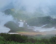●山頂で約1時間天候の回復を待ったのだが回復の兆しも見られず、また寒さに耐えられなくなってきたので、仕方なく山頂を後にする。九合目までは足元が滑りやすい道を、石などを落とさないように気を遣いビビリながら急勾配の斜面を下る。相変わらず強風は収まらなかったが、八合目付近からガスが取れ視界も徐々に良くなり、数度の休憩で下界の眺望を楽しみながら利尻北麓野営場登山口へと向かう。