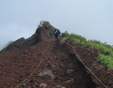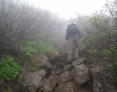 ●往路の道中は強風が吹き荒れ、また濃いガスにも覆われ視界の悪い状況が続く中、髪の毛をビショビショに濡らしながら山頂を目指す。このコースの最大の難所である九合目の正念場で息も上がり、身体はヘトヘトとなりながらも何とか予定の時間より早くに利尻山頂(北峰)に到着する。なお、この山の最高峰は南峰となっているが、大変危険なため立ち入り禁止となっている。